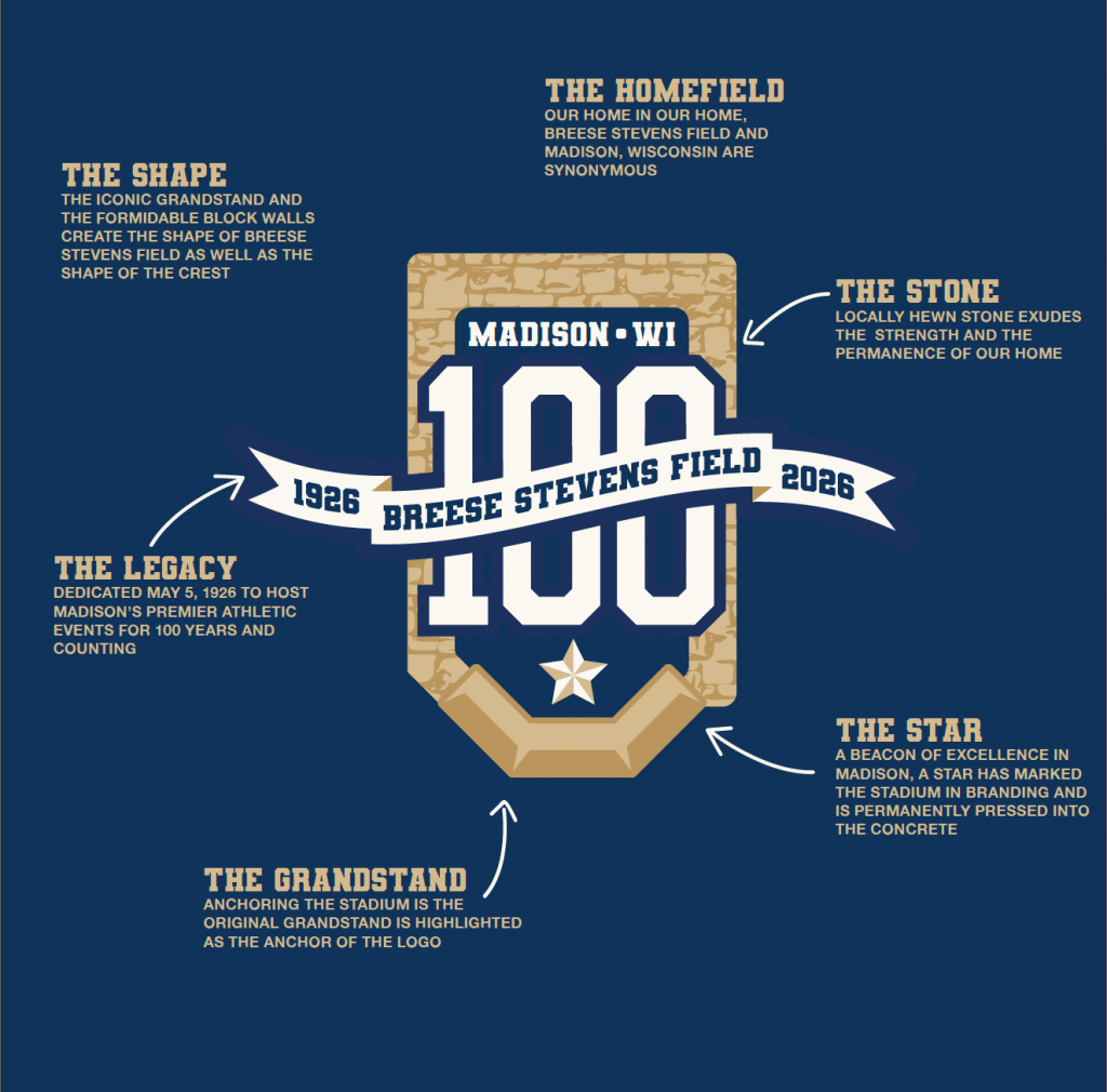 In honor of the 100th year, Breese Stevens Field debuts an anniversary logo for the celebration. The logo represents the historic and iconic brick facade that encompasses the stadium. Additionally, it highlights the original and still standing grandstand at the bottom of the design. It includes a star, or beacon of excellence in Madison. A star has marked the stadium in branding and is permanently pressed into the concrete.